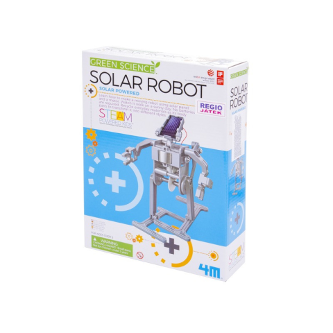 Egy dínó, robot vagy szörny, amit a napfény hajt! Még elem se kell hozzá! A 4M napelemes robot készlet megtanít a megújuló energia helyes használatára tudományos módon! Az alkatrészeket több módon is össze tudod rakni, a végeredmény egy robot lesz, amit napfénnyel, vagy akár egy erősebb lámpával is mozgásra tudsz bírni. A darabokból egy egyszerű robotot, a játék csomagolását felhasználva egy tátogó dínót, vagy egy műanyag pohárral és két villával egy ij