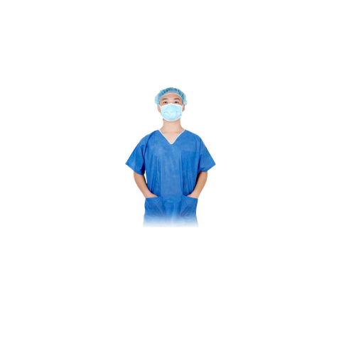 Egyszer használatos kék színű zsilipruha (40 gramm). V nyakú rövdi újjú felső és egyenes szárú nadrág. Anyaga: 100% PP nemszőtt textília 40 g/m2, oxidatív biológiai úton lebomló. Felső: V nyakú rövdi újjú felső. Nadrág: egyenes szárú, derékvonalban könn