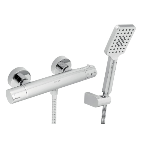 Termosztatikus fali zuhanykeverő káddal, krómozott kivitelben. A keverő áramlási sebessége 8 liter/perc. Csaptelep osztása 150 mm. Fényes színben.