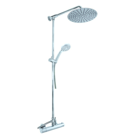 Termosztatikus fali zuhany csaptelep zuhanyszettel együtt. Króm kivitelben. A csaptelepek távolsága 150 mm.