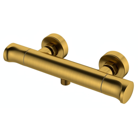 Termosztatikus fali zuhany csaptelep zuhanyszett nélkül. Csiszolt arany színkivitelben. A csaptelepek távolsága 150 mm. Matt felülettel.