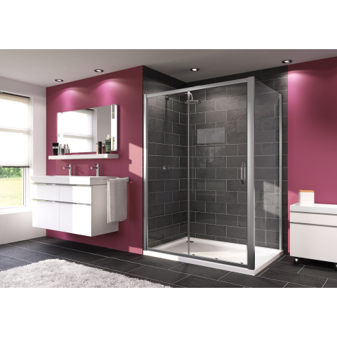 Zuhanyajtó tálca nélkül matt króm színben, a felület átlátszó üvegből készült dekor nélküli. A Hüppe Anti-Plaque technológiával - a gyártás során alkalmazott felületkezeléssel, amely megkönnyíti a tisztítást, és lehetővé teszi, hogy a víz apró cseppek formájában folyjon le. Tolóajtó rendszer. Bal és jobb oldali tájolás is.