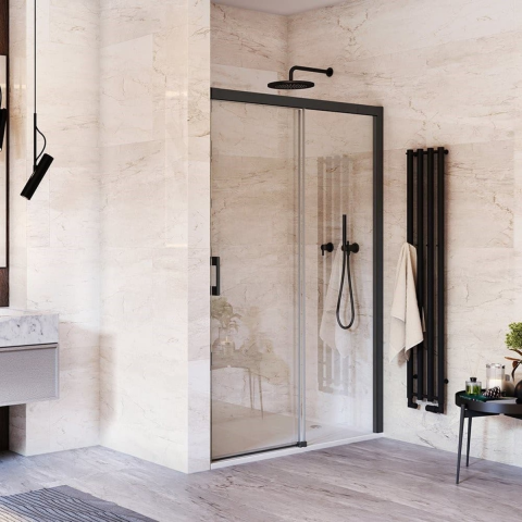 Zuhanyajtó tálca és színes profilok nélkül, matt fekete színben, a kitöltés díszítés nélküli, tiszta üvegből készült. RothETC kivitelben, amely az üveg könnyebb tisztítását biztosítja a víztaszító hatásnak köszönhetően. A víz cseppekben folyik le az üvegről, és magával viszi a szennyeződések és a vízkő nagy részét. Csúsztatható nyitású rendszer. Megjelölés - jobb oldali tájolás.