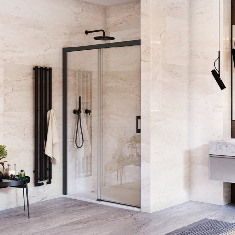 Zuhanyajtó tálca és színes profilok nélkül, matt fekete színben, a kitöltés díszítés nélküli, tiszta üvegből készült. RothETC kivitelben, amely az üveg könnyebb tisztítását biztosítja a víztaszító hatásnak köszönhetően. A víz cseppekben folyik le az üvegről, és magával viszi a szennyeződések és a vízkő nagy részét. Csúsztatható nyitású rendszer. Megjelölés - bal oldali tájolás.