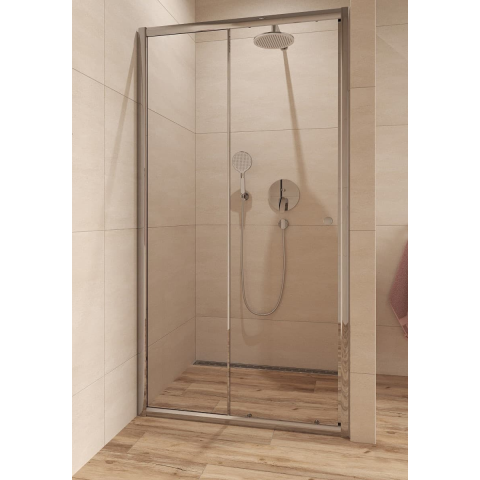 Zuhanyajtó beleértve a résprofilt is fényes krómban, a felület átlátszó üvegből készült dekor nélküli. Tolóajtó rendszer. bal és jobb oldali tájolás is.