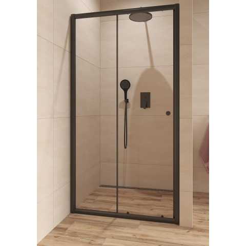 Zuhanyajtó beleértve a résprofilt is fekete színben, a felület átlátszó üvegből készült dekor nélküli. Tolóajtó rendszer. bal és jobb oldali tájolás is.