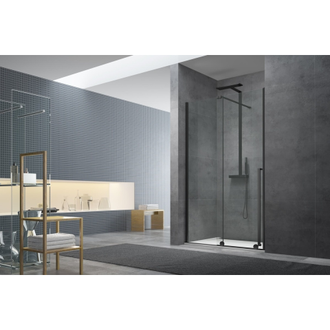Zuhanyajtó beleértve a résprofilt is fekete matt színben, a felület átlátszó üvegből készült dekor nélküli. Easy Clean felületkezeléssel, amely megkönnyíti a tisztítást, és minimalizálja a vízkőlerakodást. Tolóajtó rendszer. Bal és jobb oldali tájolás is.