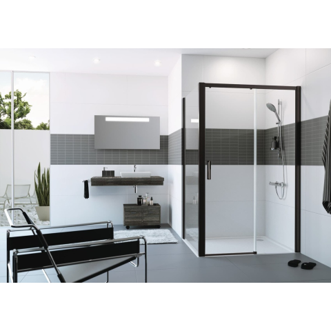 Zuhanyajtó tálca nélkül fekete színben, a felület átlátszó üvegből készült dekor nélküli. A Hüppe Anti-Plaque technológiával - a gyártás során alkalmazott felületkezeléssel, amely megkönnyíti a tisztítást, és lehetővé teszi, hogy a víz apró cseppek formájában folyjon le. Tolóajtó rendszer. jobb oldali tájolás.