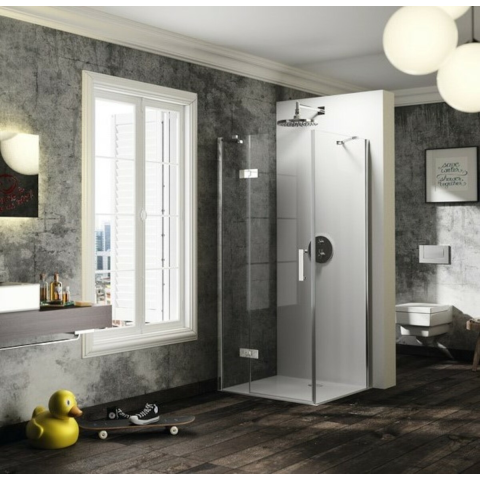 Zuhanyajtó tálca nélkül fényes krómban, a felület átlátszó üvegből készült dekor nélküli. A Hüppe Anti-Plaque technológiával - a gyártás során alkalmazott felületkezeléssel, amely megkönnyíti a tisztítást, és lehetővé teszi, hogy a víz apró cseppek formájában folyjon le. Elforgatható nyitórendszer. Bal oldali tájolás.