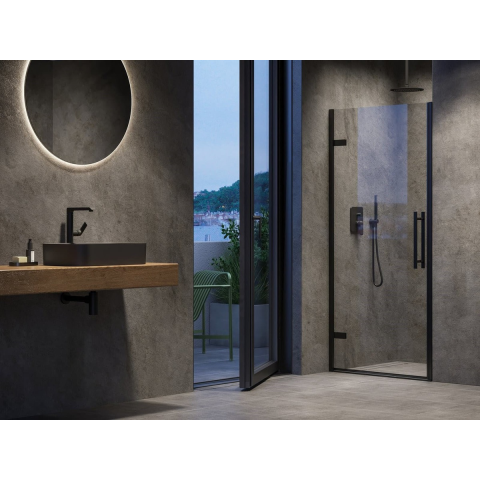 Zuhanyajtó beleértve a résprofilt is fekete matt színben, a felület átlátszó üvegből készült dekor nélküli. A RAVAK AntiCalc® technológiának köszönhetően az üveg víztaszító tulajdonságokkal rendelkezik, ami azt jelenti, hogy az üveg felülete víztaszítóvá válik. Pántos nyitórendszer. bal és jobb oldali tájolás is.