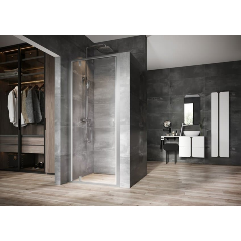 Zuhanyajtó tálca nélkül matt króm színben, a felület átlátszó üvegből készült dekor nélküli. A RAVAK AntiCalc® technológiának köszönhetően az üveg víztaszító tulajdonságokkal rendelkezik, ami azt jelenti, hogy az üveg felülete víztaszítóvá válik. Elforgatható nyitórendszer. Bal és jobb oldali tájolás is.
