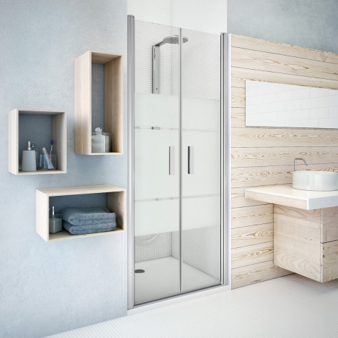 Zuhanyajtó kád nélkül, profilok színe fényes króm, a kitöltés átlátszatlan üvegből készült, Intimglass dekorációval. A termék Rolshield felületkezeléssel van ellátva, amely megvédi az üveget a szennyeződések lerakódásától, és karbantartása könnyebb, mint valaha. Forgó nyitható rendszer. Bal és jobb oldali elrendezés.