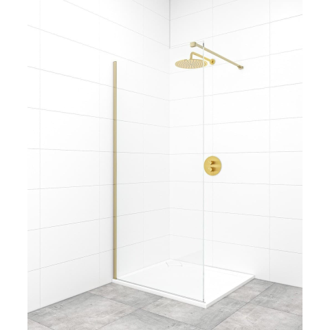 Walk-in zuhanyparaván profilokkal és merevítővel sárgaréz, a felület átlátszó üvegből készült dekor nélküli. Easy Clean felületkezeléssel, amely megkönnyíti a tisztítást, és minimalizálja a vízkőlerakodást. Fix - nem nyitható meg. bal és jobb oldali tájolás is.