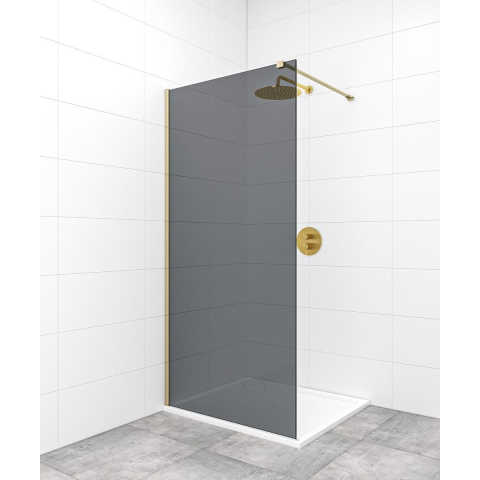 Walk-in zuhanyparaván profilokkal és merevítővel sárgarézés füsthatású dekorációval rendelkezik és füsthatású dekorációval rendelkezik. Easy Clean felületkezeléssel, amely megkönnyíti a tisztítást, és minimalizálja a vízkőlerakodást. Fix - nem nyitható meg. bal és jobb oldali tájolás is.