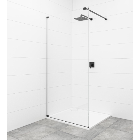 Walk-in zuhanyparaván pántokkal és merevítővel fekete matt színben, a felület átlátszó üvegből készült dekor nélküli. Easy Clean felületkezeléssel, amely megkönnyíti a tisztítást, és minimalizálja a vízkőlerakodást. Fix - nem nyitható meg. bal és jobb oldali tájolás is.