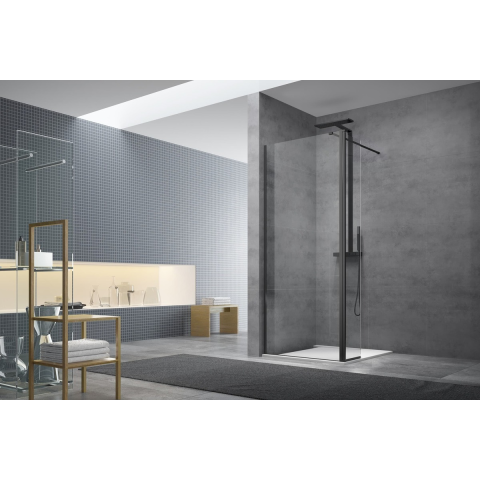 Walk-in zuhanyparaván profilokkal, merevítővel és forgófallal fekete matt színben, a felület átlátszó üvegből készült dekor nélküli. Easy Clean felületkezeléssel, amely megkönnyíti a tisztítást, és minimalizálja a vízkőlerakodást. Fix - nem nyitható meg. bal és jobb oldali tájolás is.