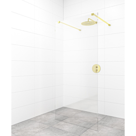 Walk-in zuhanyparaván szellőztetéssel arany fényes kivitelű profilokkal, a felület átlátszó üvegből készült dekor nélküli. Easy Clean felületkezeléssel, amely megkönnyíti a tisztítást, és minimalizálja a vízkőlerakodást. Fix - nem nyitható meg. bal és jobb oldali tájolás is.