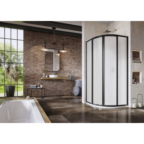 Zuhanysarok tálca nélkül fekete színben, a felület átlátszatlan műanyagból készült pearl dekorral. Tolóajtó rendszer. Bal és jobb oldali tájolás is.