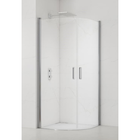 Zuhanysarok fogantyú és tálca nélkül fényes krómban, a felület átlátszó üvegből készült dekor nélküli. Easy Clean felületkezeléssel, amely megkönnyíti a tisztítást, és minimalizálja a vízkőlerakodást. Forgónyitó rendszer bal és jobb oldali tájolás is.