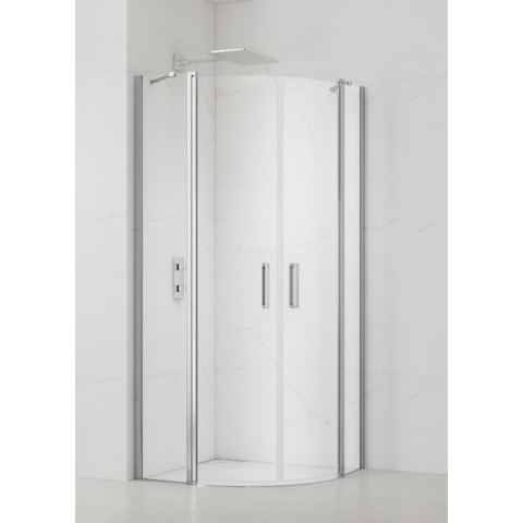 Zuhanysarok fogantyú és tálca nélkül fényes krómban, a felület átlátszó üvegből készült dekor nélküli. Easy Clean felületkezeléssel, amely megkönnyíti a tisztítást, és minimalizálja a vízkőlerakodást. Forgónyitó rendszer bal és jobb oldali tájolás is.