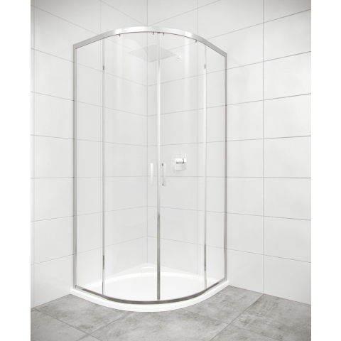Zuhanysarok fogantyú és tálca nélkül fényes krómban, a felület átlátszó üvegből készült dekor nélküli. Az üveg könnyű karbantartásával. Tolóajtó rendszer. Bal és jobb oldali tájolás is.