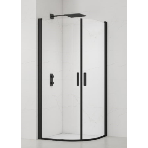 Zuhanysarok fogantyú és tálca nélkül fekete matt színben, a felület átlátszó üvegből készült dekor nélküli. Easy Clean felületkezeléssel, amely megkönnyíti a tisztítást, és minimalizálja a vízkőlerakodást. Forgónyitó rendszer bal és jobb oldali tájolás is.