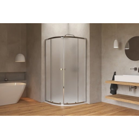 Zuhanysarok tálcával fényes krómban, a felület átlátszatlan üvegből készült Chinchilla dekorral. Tolóajtó rendszer. bal és jobb oldali tájolás is.