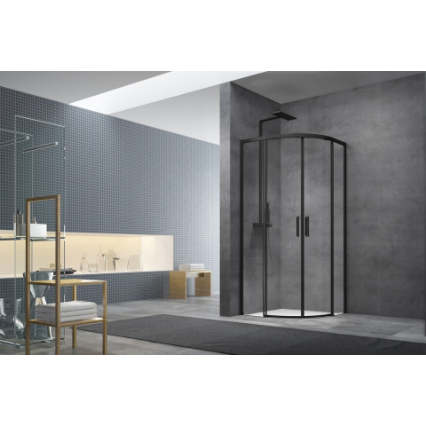 Zuhanysarok fogantyú és tálca nélkül fekete színben, a felület átlátszó üvegből készült dekor nélküli. Easy Clean felületkezeléssel, amely megkönnyíti a tisztítást, és minimalizálja a vízkőlerakodást. Tolóajtó rendszer. Bal és jobb oldali tájolás is.