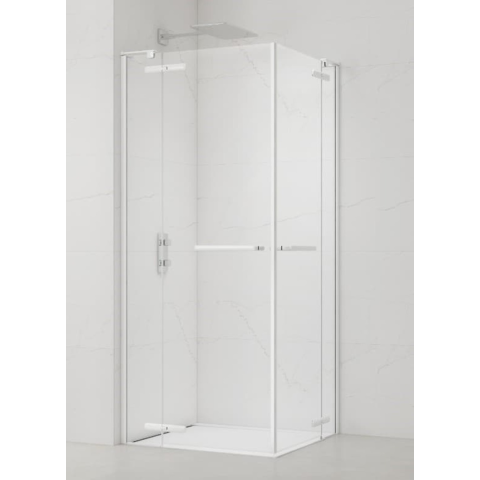 Zuhanykabin tálca nélkül és fehér színű profilokkal, a töltés tiszta üvegből készült, díszítés nélkül. A termék Easy Clean felületkezeléssel rendelkezik, amely megkönnyíti a tisztítást és minimalizálja a vízkőlerakódást. Pántos nyitású rendszer. Megjelölés - bal és jobb tájolás.