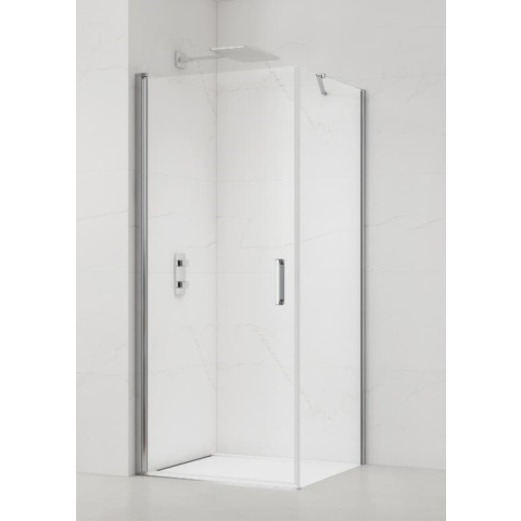 Zuhanysarok fogantyú és tálca nélkül fényes krómban, a felület átlátszó üvegből készült dekor nélküli. Easy Clean felületkezeléssel, amely megkönnyíti a tisztítást, és minimalizálja a vízkőlerakodást. Forgónyitó rendszer bal és jobb oldali tájolás is.
