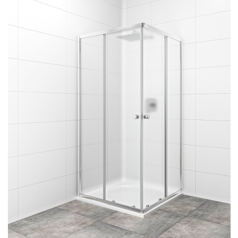 Zuhanysarok tálca nélkül fényes krómban, a felület átlátszatlan üvegből készült. Tolóajtó rendszer. Bal és jobb oldali tájolás is.