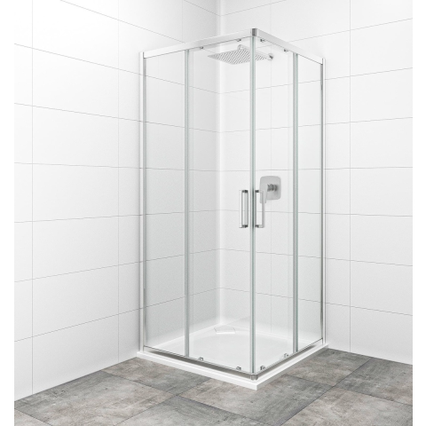 Zuhanysarok fogantyú és tálca nélkül fényes krómban, a felület átlátszó üvegből készült dekor nélküli. Az üveg könnyű karbantartásával. Tolóajtó rendszer. Bal és jobb oldali tájolás is.