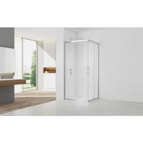 Zuhanysarok tálcával fényes krómban, a felület átlátszó üvegből készült dekor nélküli. Easy Clean felületkezeléssel, amely megkönnyíti a tisztítást, és minimalizálja a vízkőlerakodást. Tolóajtó rendszer. bal és jobb oldali tájolás is.