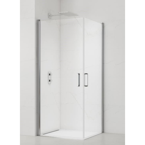 Zuhanysarok fogantyú és tálca nélkül fényes krómban, a felület átlátszó üvegből készült dekor nélküli. Easy Clean felületkezeléssel, amely megkönnyíti a tisztítást, és minimalizálja a vízkőlerakodást. Forgónyitó rendszer bal és jobb oldali tájolás is.