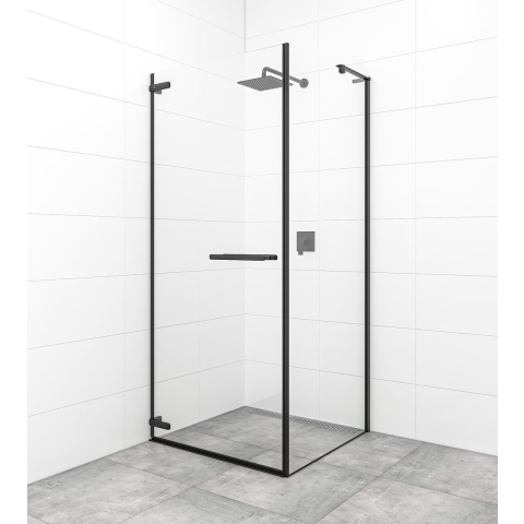 Zuhanysarok tálca nélkül fekete színben, a felület átlátszó üvegből készült dekor nélküli. Easy Clean felületkezeléssel, amely megkönnyíti a tisztítást, és minimalizálja a vízkőlerakodást. Elforgatható nyitórendszer. bal és jobb oldali tájolás is.