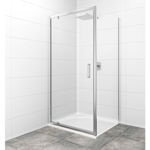 Tiszta üveg zuhanyajtó. Profilok fényes krómban. A termék Easy Clean kivitelű, amely megkönnyíti a tisztítást és minimalizálja a vízkőlerakódást. Forgatható nyitórendszer. Bal és jobb tájolás. Edzett 6 mm-es biztonsági üveg, 195 cm.