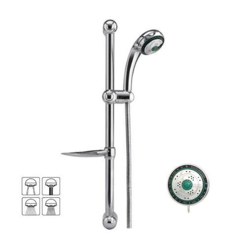 Zuhanyszett — zuhanyfej + tömlő + sín, 80 mm, 150 cm, króm TO-75558Műszaki adatokZuhanyfej átmérő: 8 cm (80 mm)Tömlő hossza: 150 cmCsatlakozó menet: G1/2 (kb. 12,7 mm)Zuhanyfunkciók száma: 4Sín anyaga: rozsdamentes acélFelület: krómJellemzőkFalra szerelhető rozsdamentes acél sín állítható zuhanytartóval és beépített szappantartóval.A zuhanyfej négy üzemmóddal rendelkezik; a fúvókák gumírozott csatornái megakadályozzák a vízkőlerakódást és könnyítik