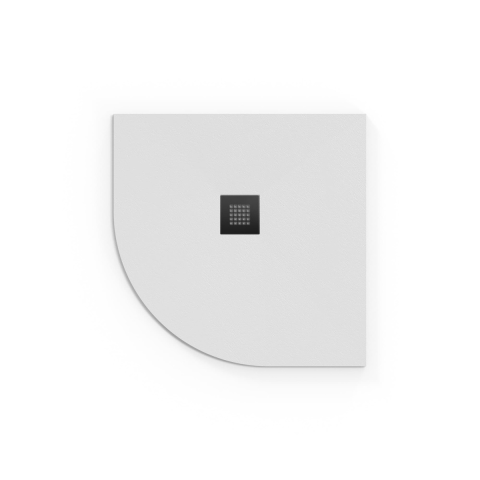 Fehér öntött márványból készült, 90x90x2,6 cm méretű zuhanytálca. A tálca sugara R 550. Szifon mellékelve és lábak része.