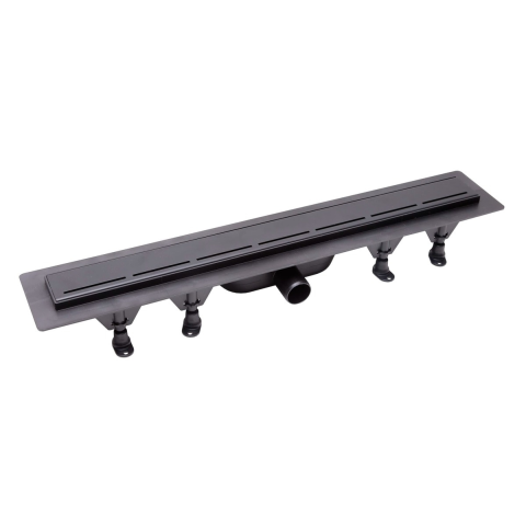 Rozsdamentes acél ráccsal együtt. 75 cm-es raszterszélességű műanyag zuhanyfolyóka matt fekete színben. Minimális építési magasság 6,6 cm. Lefolyócső átmérője DN 40-es csatlakozóhoz. A szifon és a lábak a csomag részét képezik.