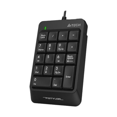 Numerikus billentyűzet - FK13P, 18 gomb csökkentett profilú, USB csatlakozó, kábel hossza 1,5m A4tech, USB Notebooks without a numeric keypad will be reliably complemented by A4tech FSTYLER FK13P keyboards with a reduced profile. The numeric keypad has 18 keys and you can easily connect it via a 1.