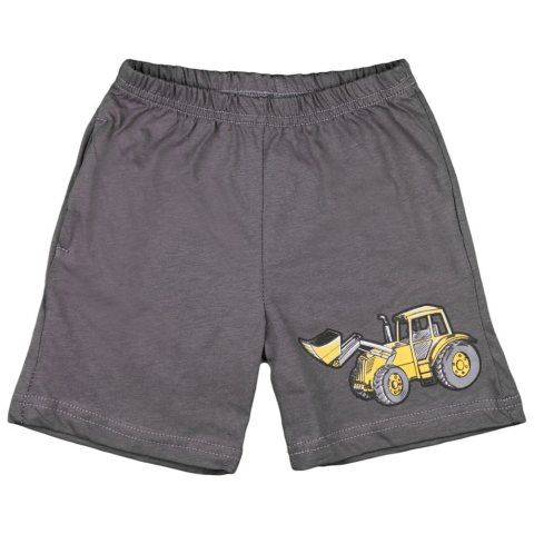 Praktikus és kényelmes pamut rövidnadrág kisfiúknak szürke alapon vidám markoló mintával. Az oldalsó zseb remek helyet biztosít a kedvenc játékoknak vagy apró tárgyaknak, míg a rugalmas derék garantálja a tökéletes illeszkedést egész nap. Az anyag 100% pa