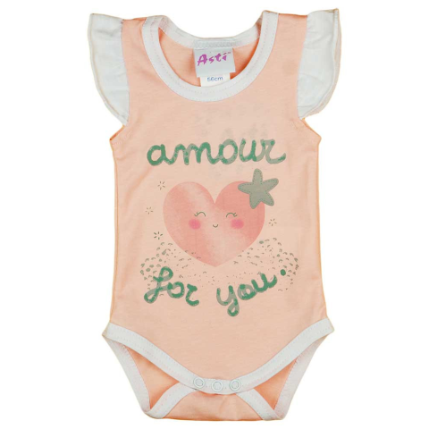 Ez az ujjatlan baba body a nyári időszak tökéletes választása. A barack alapszín szívecskés mintájával nyájas, lányos megjelenést kölcsönöz. A 100% pamutból készült, I. osztályú minőségű anyag biztosítja, hogy a baba bőre kényelmes és jól szellőztetett ma