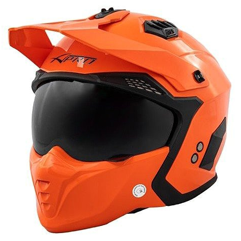 Motoros sisak - enduro, termoplast héj, ECE 22.06 homologizáció, antiscratch, UV-szűrős, sötét és antifog plexi, kivehető, mosható és hipoallergén belső, levehető arcpárna, mikrometrikus csat, tömege 1380 g (± 50 g), narancssárga, mérete M, matt felületkezelés, sport design Motocyklová modulární přilba A-Pro Alien se vyznačuje oddělávací bradovou částí a slunečním štítkem. - materiál přilby termoplast - barva oranžová mat - odmontovatelný kšilt - jednodu