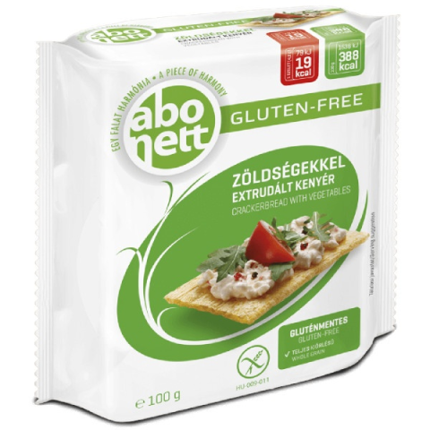 Abonett extrudált kenyér zöldségekkel gluténmentes 100 g ABONETT GLUTÉNMENTES EXTRUDÁLT KENYÉR, ZÖLDSÉGEKKEL általános emberi fogyasztásra, élelmi rostban gazdag, ropogós finomság. Kiváló alap a legkülönbözőbb feltétekhez (pl.: felvágottak, sajtok, dzs