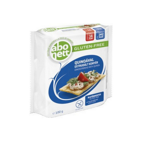 Abonett extrudált kenyér quinoával gluténmentes 100 g Abonett gluténmentes extrudált kenyér, quinoával általános emberi fogyasztásra, élelmi rostban gazdag, ropogós finomság. Kiváló alap a legkülönbözőbb feltétekhez (pl.: felvágottak, sajtok, dzsemek,
