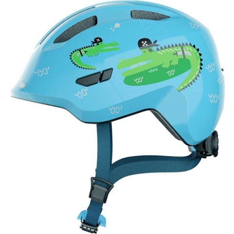 Kerékpáros sisak - gyerek, városi sisak, mérete M 50 - 55 cm fejkerülethez, in-mold technológia, rözítés rögzítő klip segítségével, EN 1078:2012+A1:2012 minősítés, konstrukció anyaga EPS, fényvisszaverő elemek, párnázás és forgókerék a méret beállításához a felszerelés része, fix napellenző, tömege 240 g, kék és zöld kivitel Az ABUS Smiley 3.0 gyerek bukósisak ideális választás a kis kerékpárosoknak, akiknek megbízható fejvédőre van szükségük m