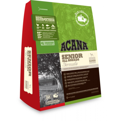 - AZ ALACSONY FEHÉRJETARTALMÚ TERMÉKEK NEM ALKALMASAK IDŐS KUTYÁK TÁPLÁLÁSÁRA, JELENTŐSEN CSÖKKENTHETIK A VÁRHATÓ ÉLETTARTAMOT! Ezért tartalmaz az ACANA SENIOR DOG helyi farmokról származó csirkehúst és tojást, Csendes-óceánból fogott lepényhalat, és a napos Okanagan-völgyben termelt gyümölcsöket és zöldségeket.
