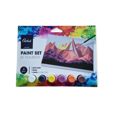 Számfestés készlet 21 cm x 14,8 cm méretben. A számfestő szett tartalmaz: 6 szín akrilfestéket, 1 db ecsetet, és egy képet, amit kikell festeni.