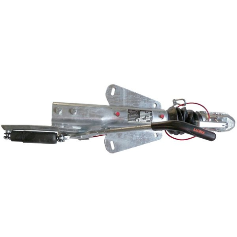Ráfutófék - alsó és felső rögzítésű, "V" alakú vonórúdhoz, tartozék vonógömbfejjel és biztonsági kötéllel, 1400 - 2700 kg-os pótkocsi össztömeghez, max. megengedett függőleges terhelés 100 kg ACI inertia brake KNOTT KF 27 B s horní a spodní montáži na oje tvaru "V". The high-quality design guarantees a vertical load of up to 100 kg with a maximum trailer weight of up to 2,700 kg.