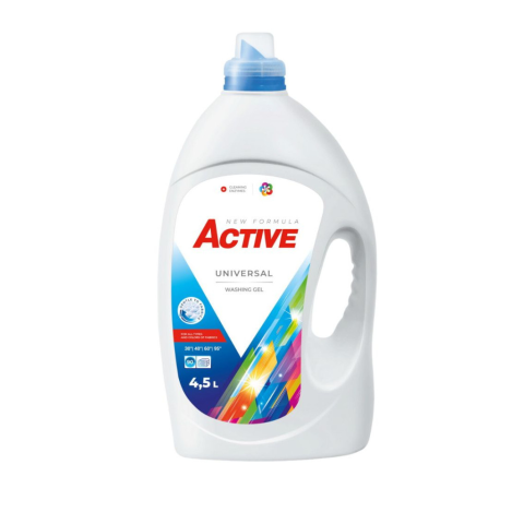 Az Active Universal mosógél kíméletesen tisztítja színes és fehér ruháit egyaránt. Megőrzi a ruhák színét és nem károsítja az anyagot. Active mosógél 4,5 L Universal (90 mosás) Az Active Mosógél Universal egy hatékony, univerzális folyékony mosószer, a